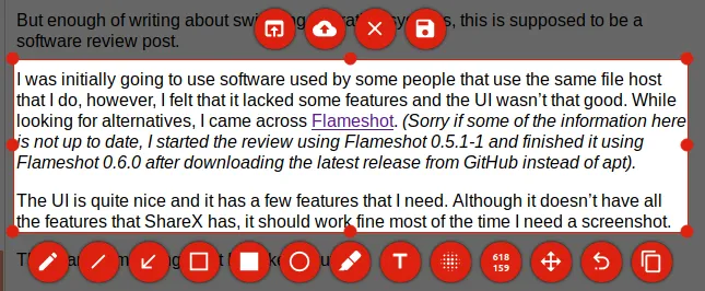I was initially going to use software used by some people that use the same file host that I do, however, I felt that it lacked some features and the UI wasn’t that good. While looking for alternatives, I came across Flameshot. (Sorry if some of the information here is not up to date, I started the review using Flameshot 0.5.1-1 and finished it using Flameshot 0.6.0 after downloading the latest release from GitHub instead of apt).